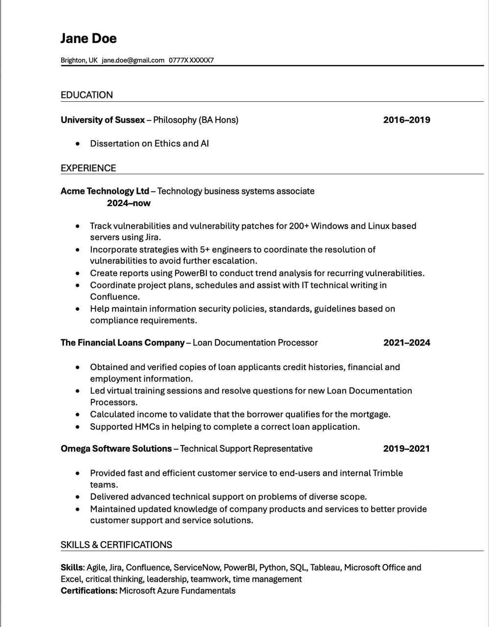 Below is an example of an ATS-friendly CV, from a design perspective only. Of course, you’d have to change the content to make sure it’s relevant to the job you’re applying for. (You can also download the CV here.)